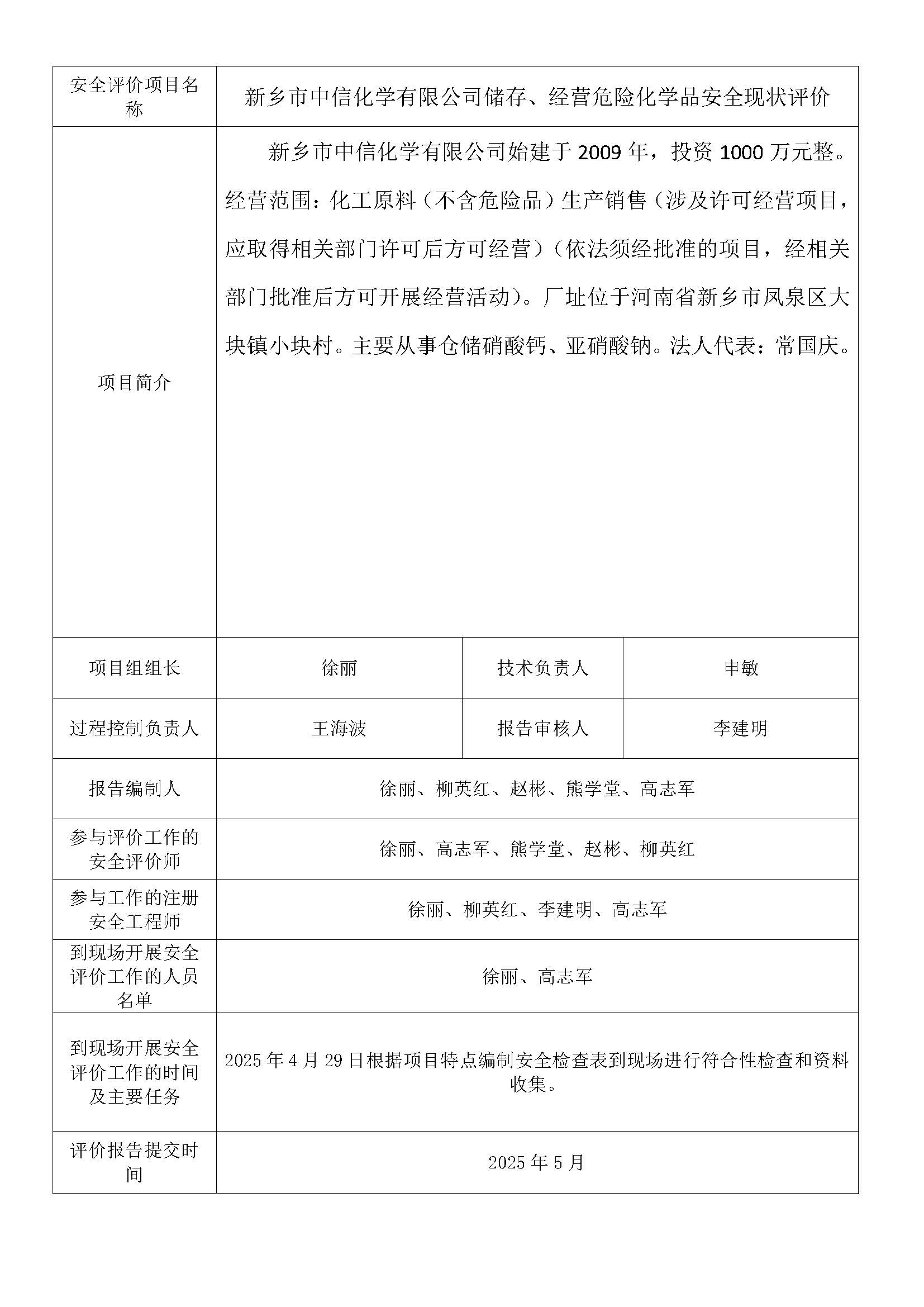 新乡市中信化学有限公司储存、经营危险化学品安全现状评价